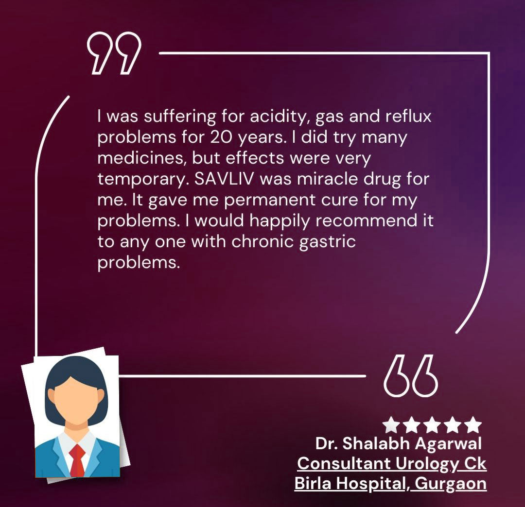 I was suffering for acidity, gas and reflux problems for 20 years. I did try many medicines, but effects were very temporary. SAVLIV was miracle drug for me. It gave me permanent cure for my problems. I would happily recommend it to any one with chronic gastric problems.