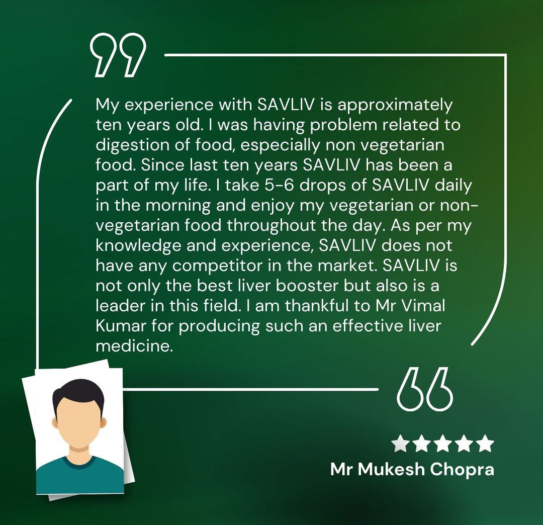 My experience with SAVLIV is approximately ten years old. I was having problem related to digestion of food, especially non vegetarian food. Since last ten years SAVLIV has been a part of my life. I take 5-6 drops of SAVLIV daily in the morning and enjoy my vegetarian or non-vegetarian food throughout the day. As per my knowledge and experience, SAVLIV does not have any competitor in the market. SAVLIV is not only the best liver booster but also is a leader in this field. I am thankful to Mr. Vimal Kumar for producing such an effective liver medicine.