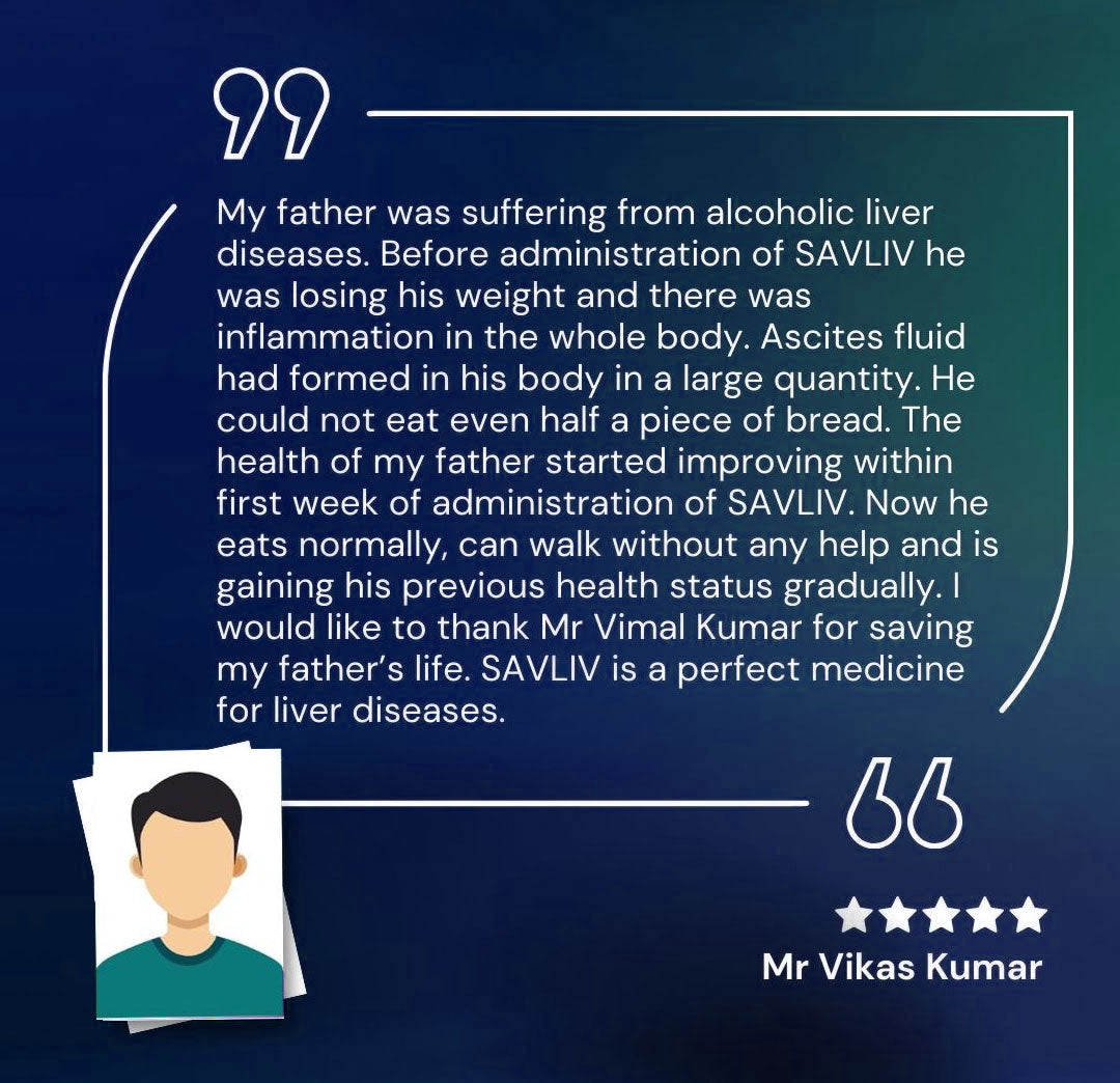 My father was suffering from alcoholic liver diseases. Before administration of SAVLIV he was losing his weight and there was inflammation in the whole body. Ascites fluid had formed in his body in a large quantity. He could not eat even half a piece of bread. The health of my father started improving within first week of administrationof SAVLIV. Now he eats normally, can walk without any help and is gaining hisprevious health status gradually. I would like to thank Mr Vimal Kumar for saving my father’s life. SAVLIV is a perfect medicine for liver diseases.