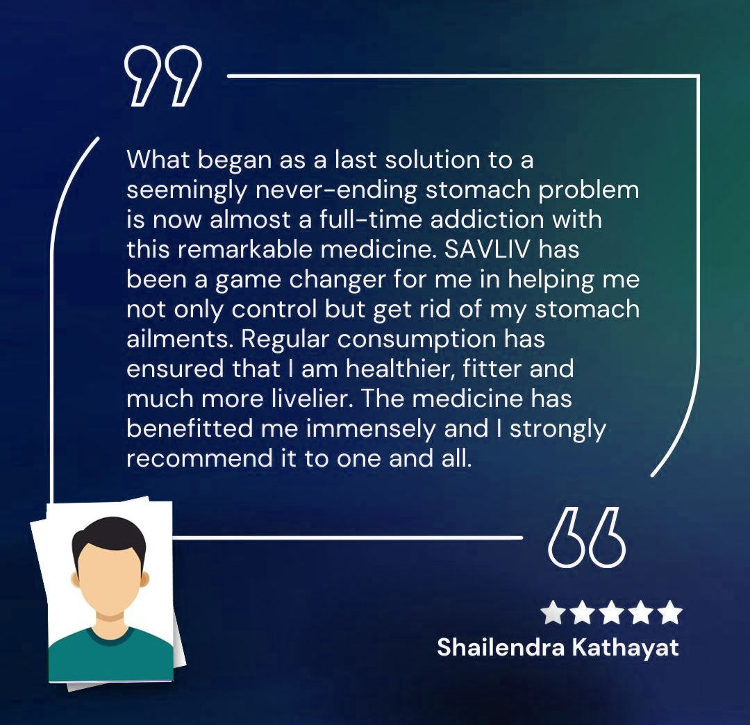 What began as a last solution to a seemingly never-ending stomach problem is now almost a full-time addiction with this remarkable medicine. SAVLIV has been a game changer for me in helping me not only control but get rid of my stomach ailments. Regular consumption has ensured that I am healthier, fitter and much more livelier. The medicine has benefitted me immensely and I strongly recommend it to one and all.