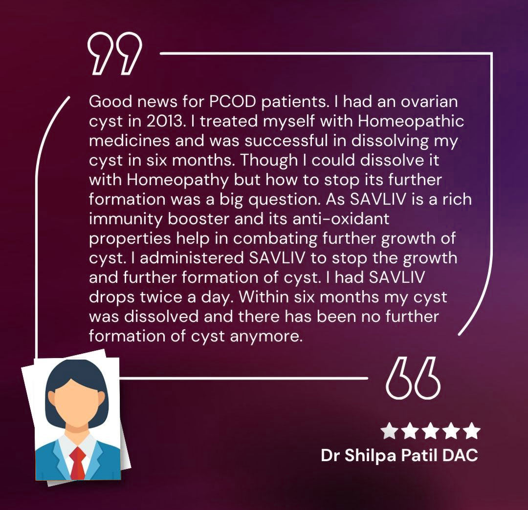 Good news for PCOD patients. I had an ovarian cyst in 2013. I treated myself with Homeopathic medicines and was successful in dissolving my cyst in six months. Though I could dissolve it with Homeopathy but how to stop its further formation was a big question. As SAVLIV is a rich immunity booster and its anti-oxidant properties help in combating further growth of cyst. I administered SAVLIV to stop the growth and further formation of cyst. I had SAVLIV drops twice a day. Within six months my cyst was dissolved and there has been no further formation of cyst anymore.